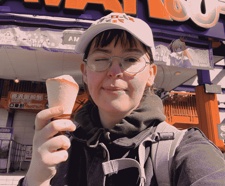 Ruby, completely alone on a solo trip in Japan, ice cream in hand, about to get on a huge rollercoaster and have the time of their life